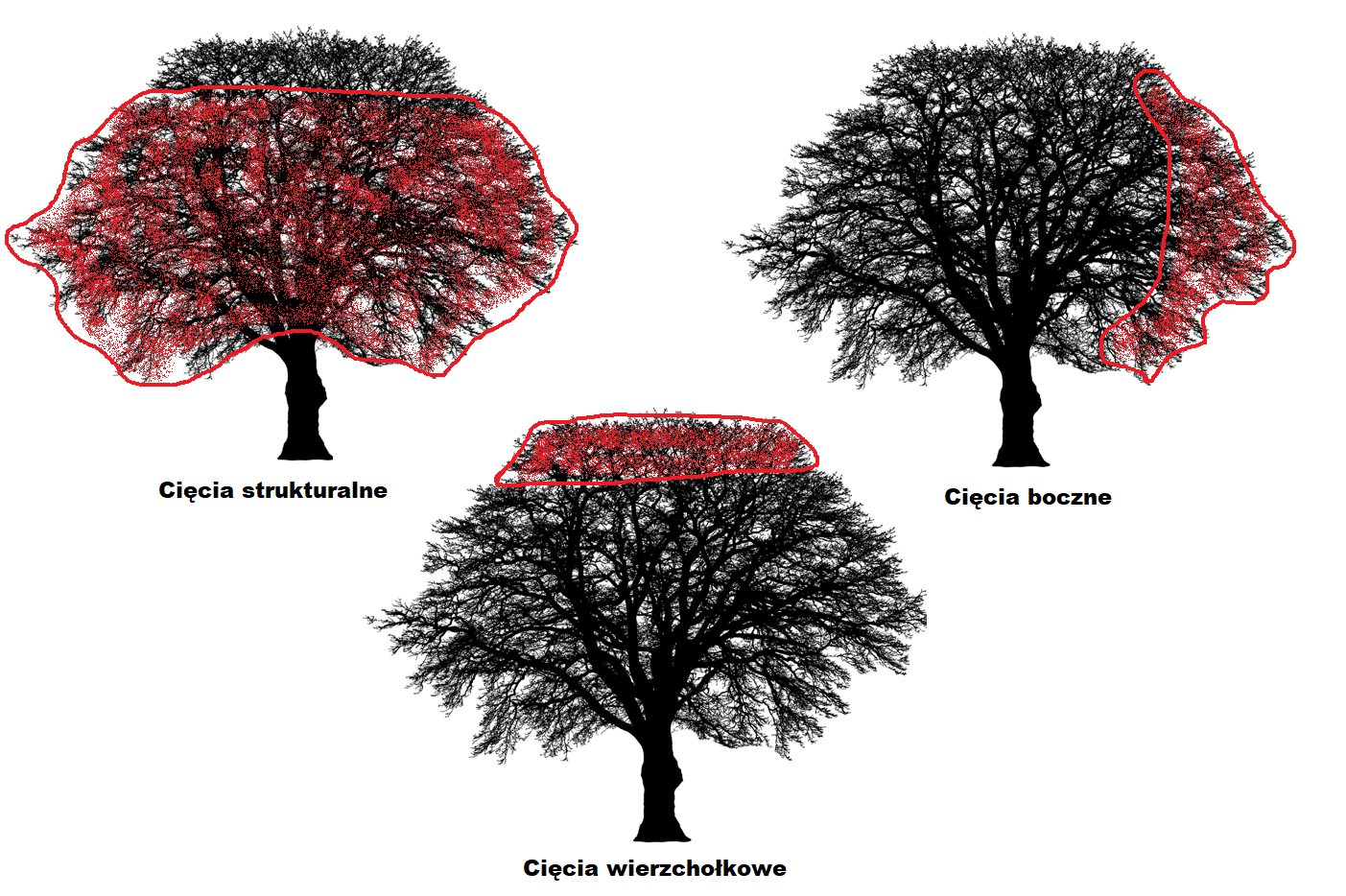 Ten rodzaj cięć powinien wynikać z osłabionej stabilności drzewa.